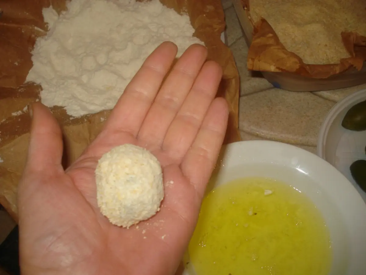 Rotoliamo la prima oliva nella farina, poi nella chiara e quindi nel pagrattato stringendo e compattando bene e friggiamola. Se l'impanatura "tiene bene" procediamo così, altrimenti facciamo il seguente passaggio: farina-albume-farina-albume-pangrattato.