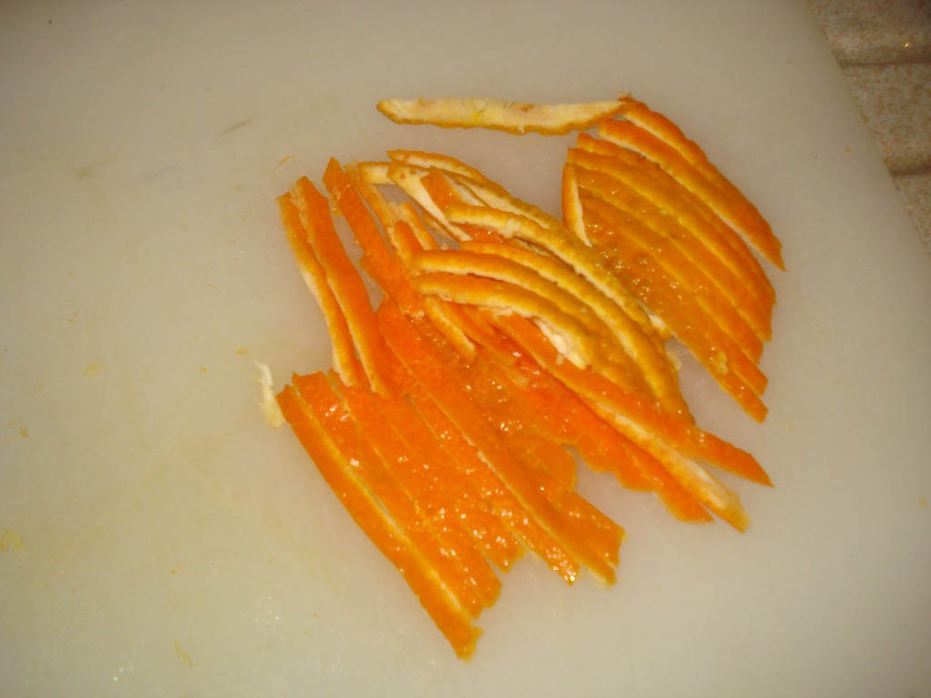Quindi procediamo a trattare le bucce per quella che di certo non è una vera e propria canditura… delicatamente con la lama liscia di un coltello grattiamo la parte bianca ed eventuali filamenti e rimasugli di polpa. Tagliamole a julienne (listerelle). Mettiamole in un pentolino e sommergiamole abbondantemente di acqua fredda. Mettiamo sul fornello e portiamo a bollore. Spegniamo e scoliamo. Ripetiamo l'operazione 2 volte.