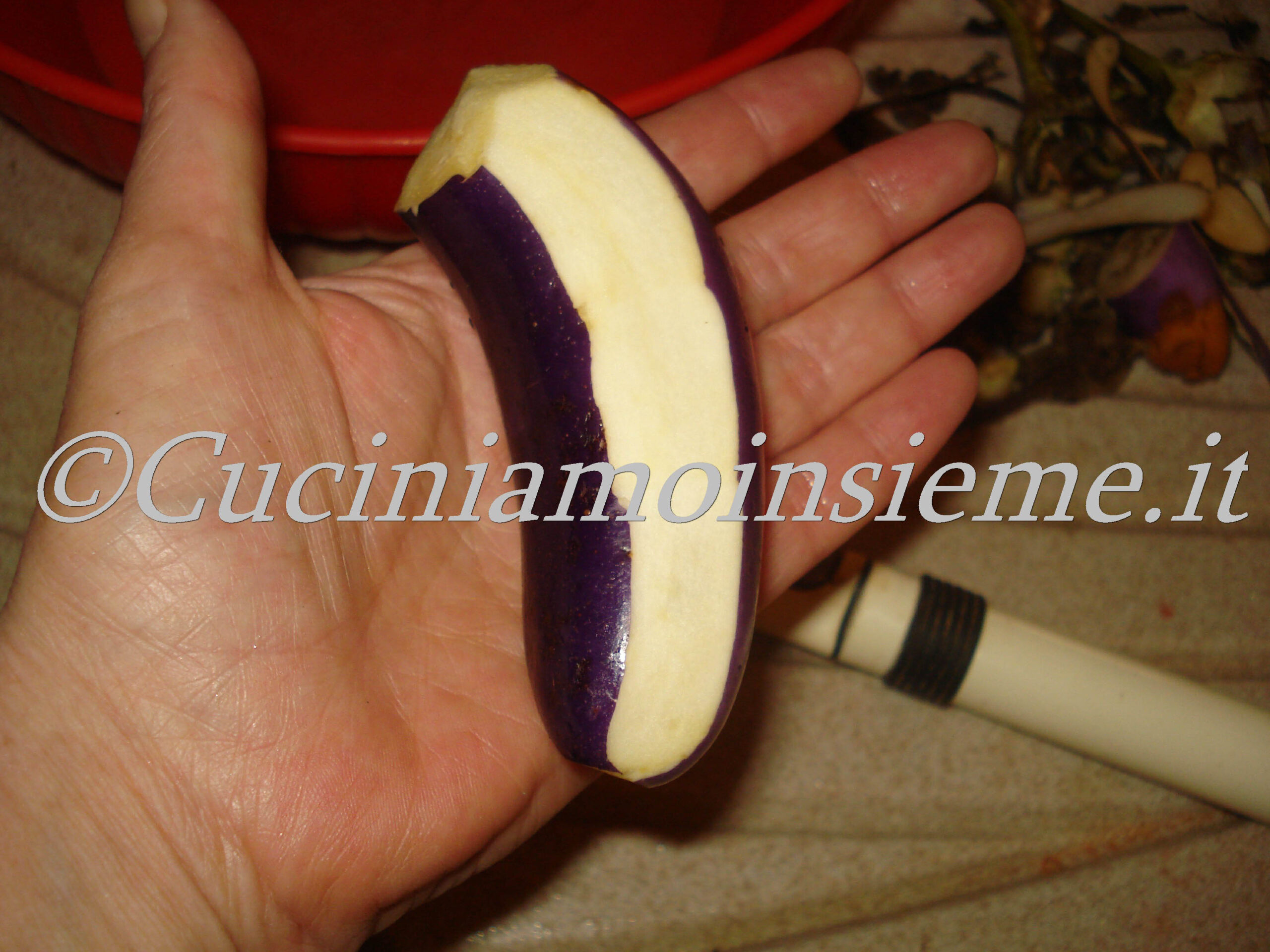 Laviamo e peliamo parzialmente (o completamente a seconda dei gusti) le melanzane, in questo caso le Perlina. Tagliamole a metà dopo aver eliminato il picciolo (o a fette se ti altro tipo).