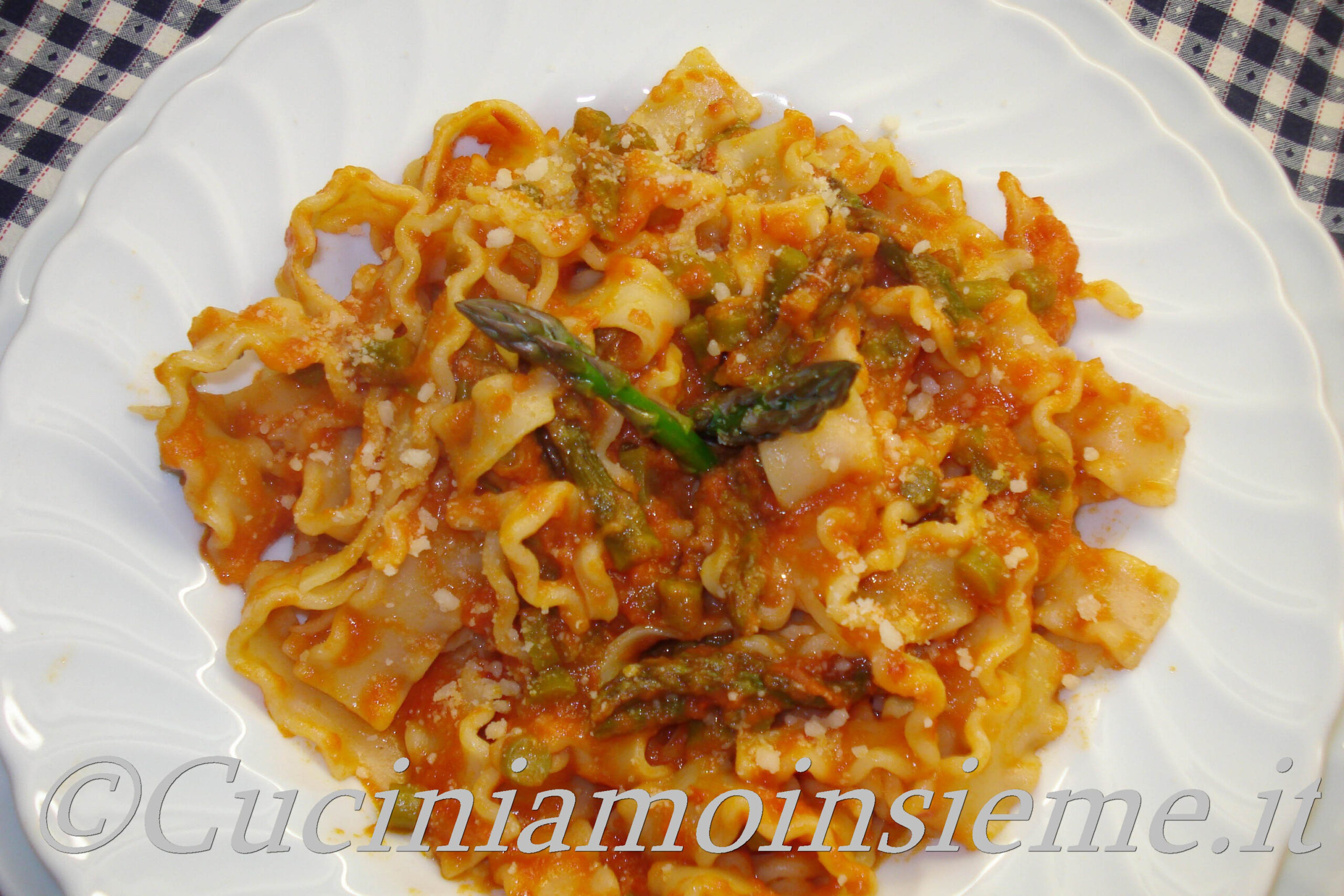 Ingredienti: pasta tipo reginette o altro, 320-400 g; asparagi selvatici o pseudo, già mondati, circa 200 g; scalogni 2; passata rustica corposa di pomodoro, 1 bottiglia; olio extravergine di oliva quanto basta; parmigianoi reggiano, o grana, secondo gusti; latte un paio di cucchiai; sale