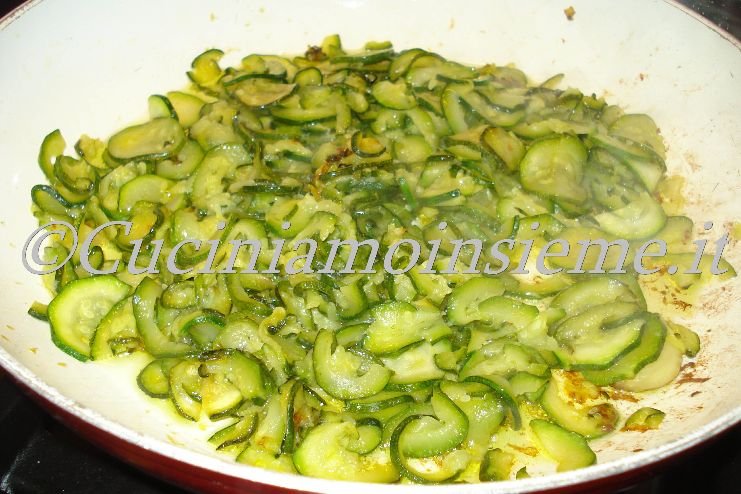 Tagliamo per il lungo le zucchine lasciandole attaccate alla sommità. Affettiamole sottilmente. In una padella capiente facciamo imbiondire il primo spicchio d'aglio; aggiungiamo: zucchine, sale, prezzemolo e peperoncino se piace, ed un nonnulla d'acqua. Portiamole a cottura lasciandole leggermente croccanti. Eliminiamo l'aglio.