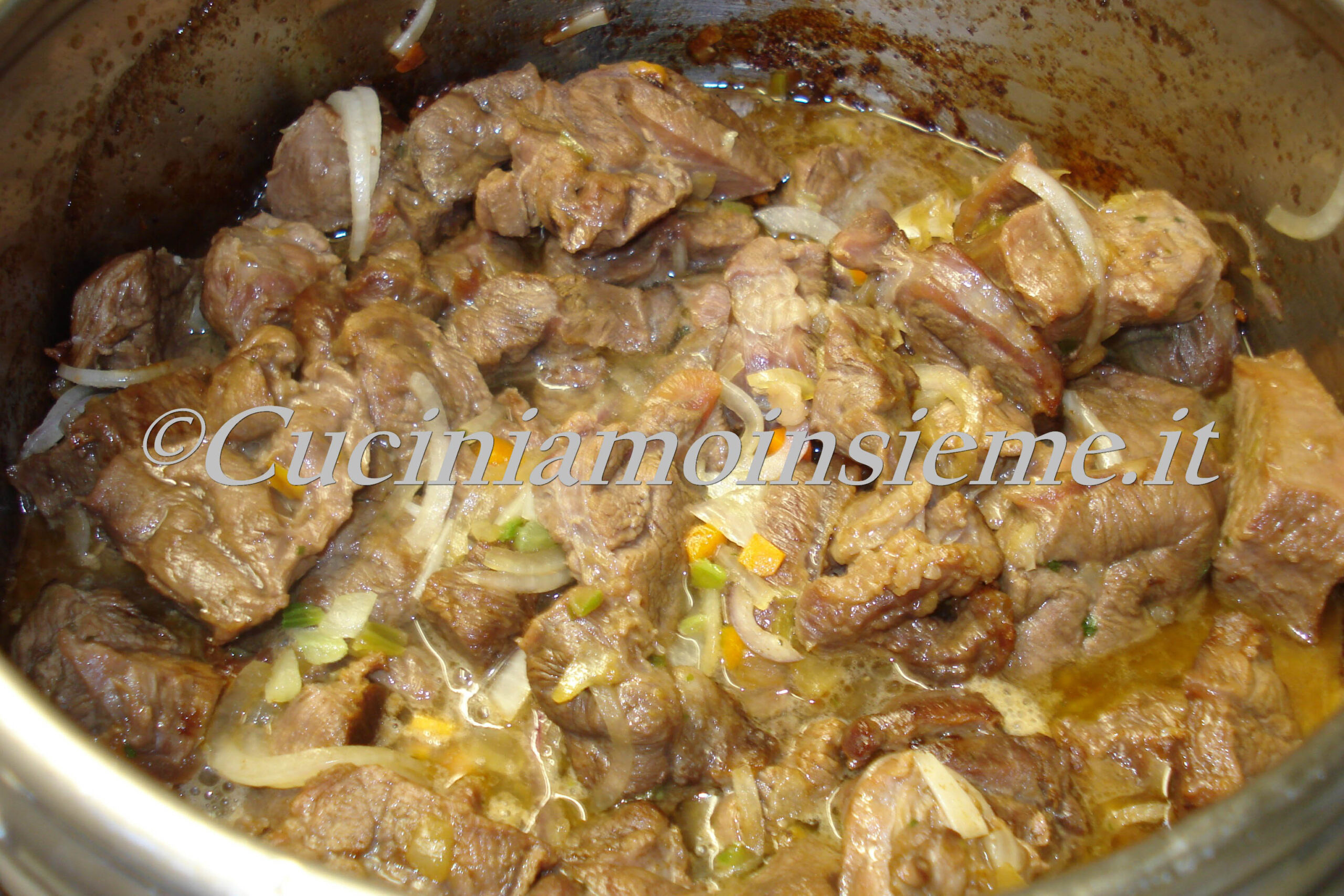 In una pentola dal fondo spesso o a pressione versiamo sufficiente olio buono, e facciamovi rosolare lo spezzatino senza salarlo. Quindi aggiungiamo il soffritto e la cipolla, saliamo, mescoliamo e a fuoco dolce facciamo evaporare il poco liquido di vegetazione che grazie al sale avranno rilasciato.