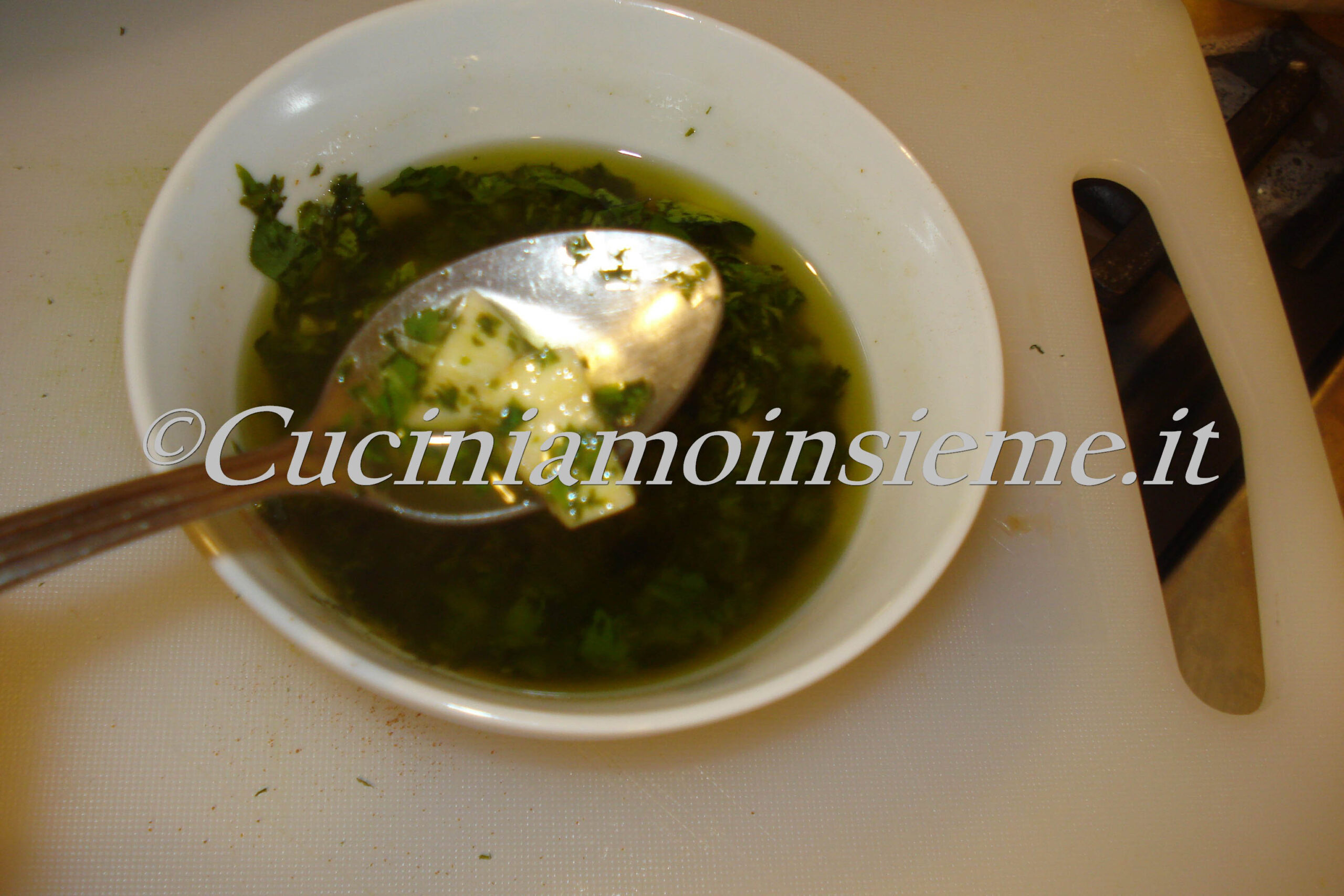 Mettiamolo in una ciotola con aglio a pezzi grandi, olio buono, peperoncino, sale, aceto e qualche goccia di limone: Mescoliamo e lasciamo insaporire |
