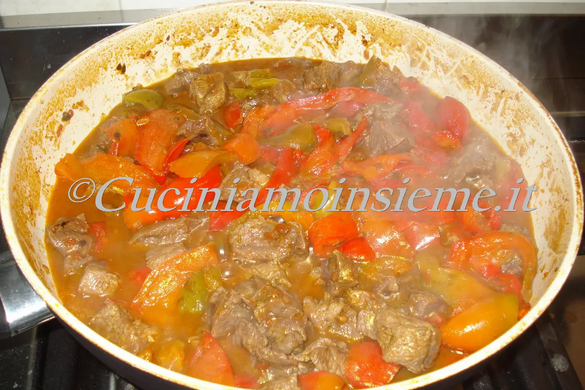 Ingredienti: polpa di vitellone (muscolo o corona o altro) circa 1 kg; peperoni grandi, 3-4; scalogno, 1 grande; aglio, 1 spicchio; pomodoro in polpa finissima, 3-4 cucchiai; prezzemolo fresco tritato, a piacere; olio extravergine di oliva quanto basta; sale qb; peperoncino a piacere