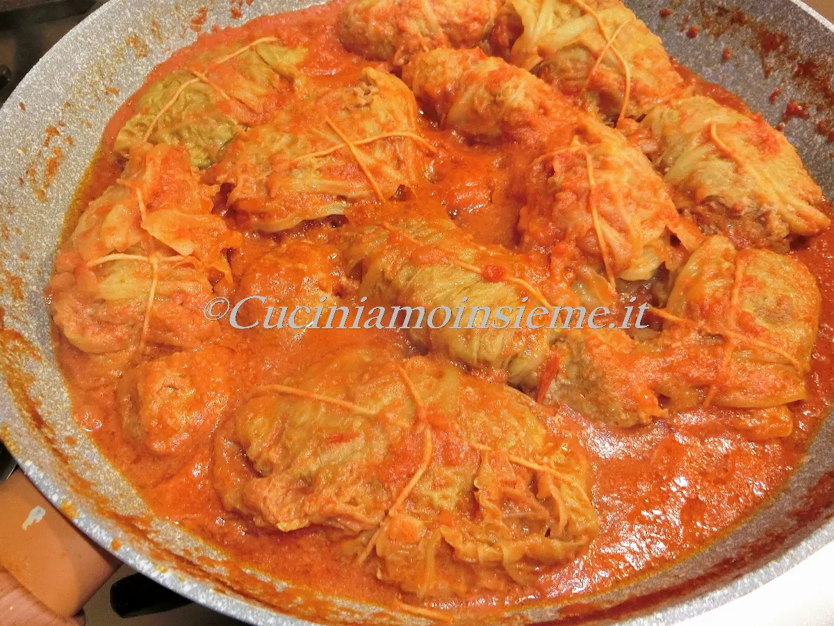 In una padella capiente in buon olio evo facciamo imbiondire la cipolla tritata fine ed 1 spicchio d'aglio tagliato in 2 che poi elimineremo. Sistemiamo gli involtini e lasciamo insaporire un paio di minuti. Quindi aggiungiamo il pomodoro secondo gusti, 1 o 2 barattoli da 400 g di polpa fine o l'equivalente di passata rustica. Saliamo, aggiungiamo un poco di acqua calda e lasciamo sobbollire. Quando il liquido sarà quasi esaurito giriamoli con delicatezza, aggiungiamo ancora via via poca acqua calda e portiamo a cottura (circa 1 ora a fuoco dolce).
