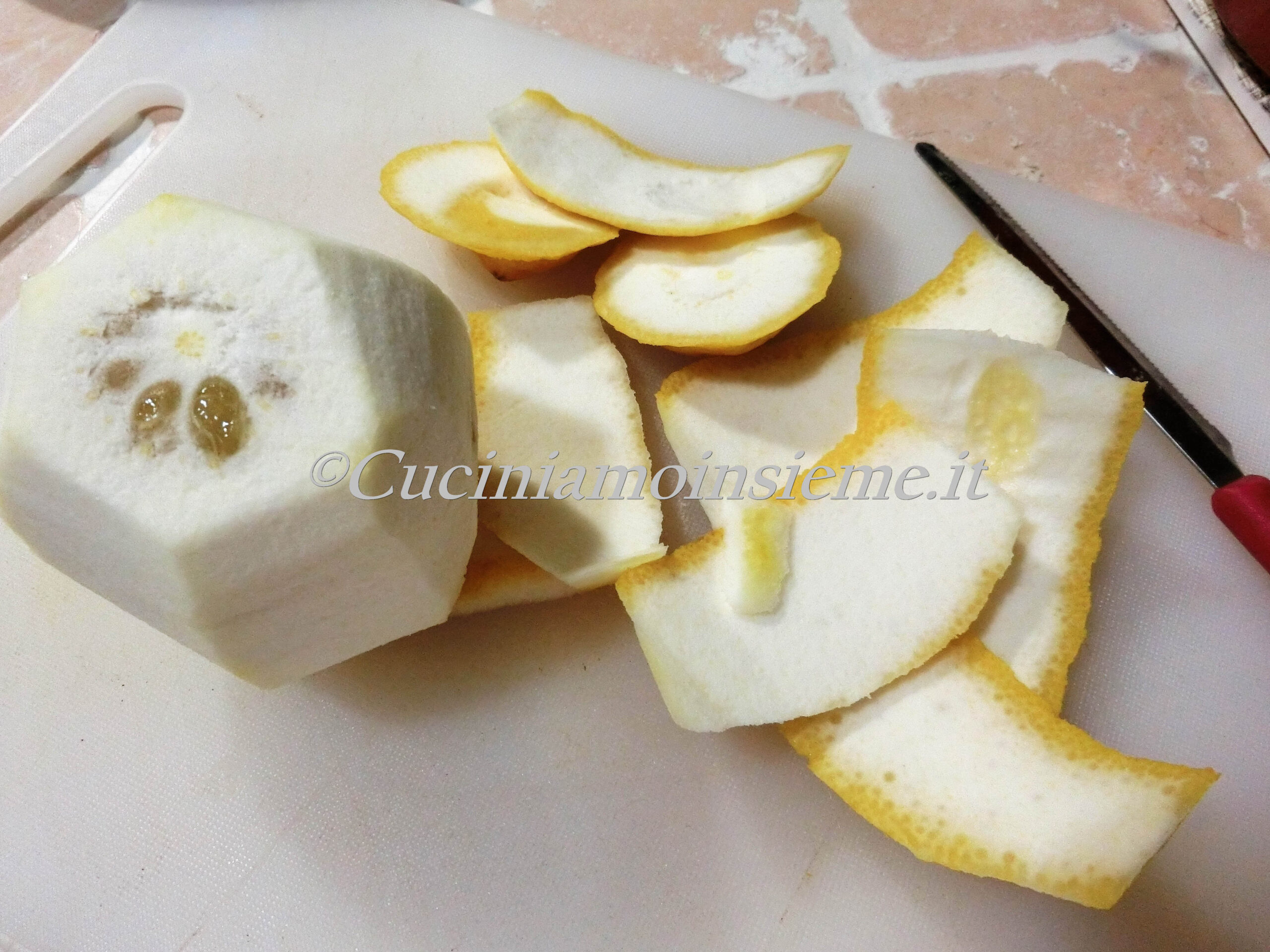 Eliminiamo ai limoni le due estremità e dunque togliamo tutta la parte gialla lasciando l'albedo (la parte bianca sotto alla buccia) che se avremo scelto i limoni giusti sarà dolce. Affettiamoli non troppo sottilmente. Eliminiamo eventuali semi e tagliamo a metà ogni fetta.