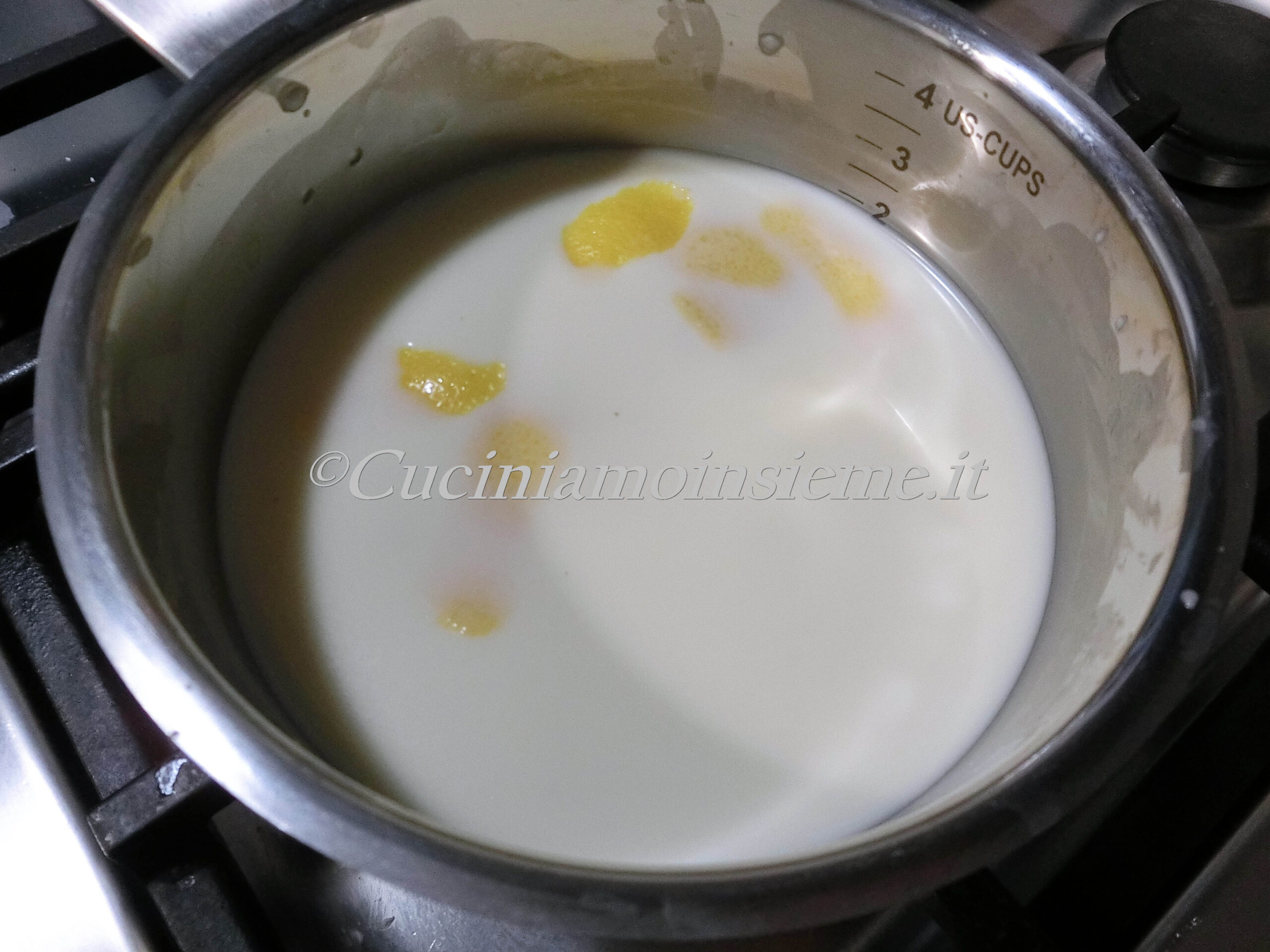 Trascorso il tempo mettiamo ad ammollare in acqua gli altri 6 grammi di gelatina. Togliamo al limone la parte gialla della buccia. In un pentolino versiamo panna e latte. Aggiungiamo lo zucchero e la buccia del limone. Mescoliamo bene e poniamo sulla fiamma. Quando sta per raggiungere il bollore spegniamo, eliminiamo la buccia di limone ed aggiungiamo la gelatina leggermente strizzata. Mescoliamo per scioglierla completamente. Lasciamola freddare.