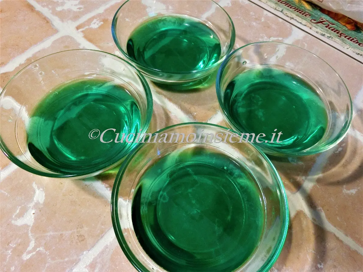 Suddividiamo nelle coppette il liquido alla menta ottenuto. Lasciamo freddare completamente, quindi poniamo in frigorifero per qualche ora, finché la gelatina non sarà rappresa.