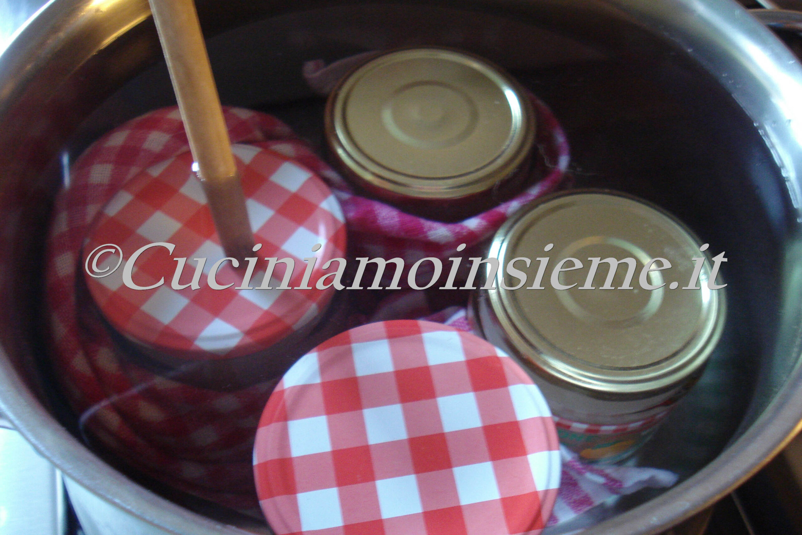 Versiamola nei barattoli di vetro sterilizzati e tappiamo ermeticamente. Mettiamo i barattoli in posizione eretta in una tentola molto alta, usando un canovaccio come separatore tra l'uno e l'altro per evitare che toccandosi in fase di bollitura si rompano. Ricopriamo d'acqua per almeno un paio di centimetri oltre il tappo.