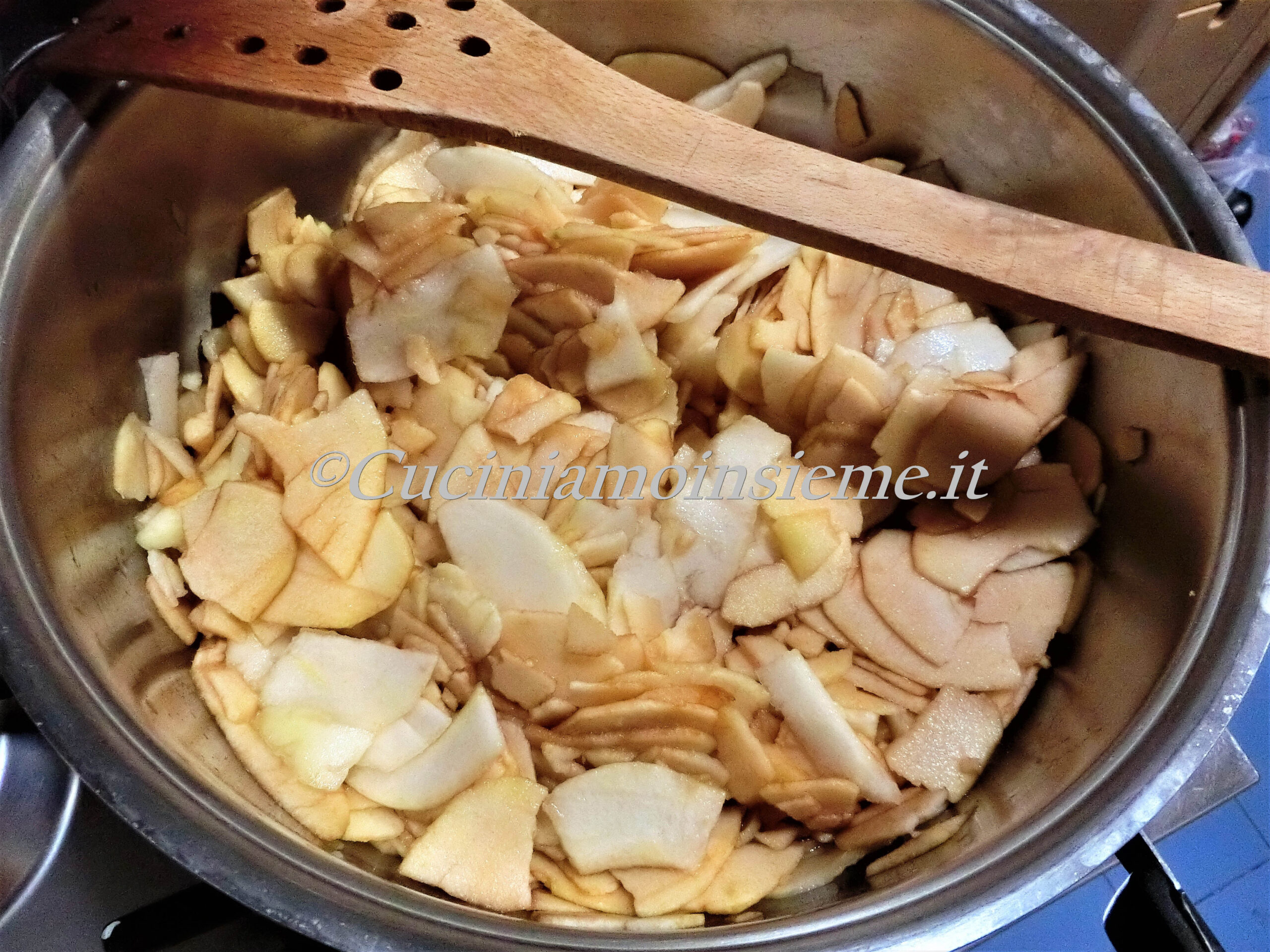 Togliamo bucce e torsoli a mele e pere. Affettiamole sottilmente e mettiamole in pentola insieme al Vin Santo. Cuociamo incoperchiato, a fuoco dolce, per una decina di minuti. Togliamo il coperchio e lasciamo quasi evaporare del tutto il liquido. Quindi aggiungiamo il mosto, e lasciamo sobbollire a lungo, senza coperchio, mescolando di tanto in tanto. Pazienza, tempo e amore sono i segreti per una buona riuscita in cucina… |