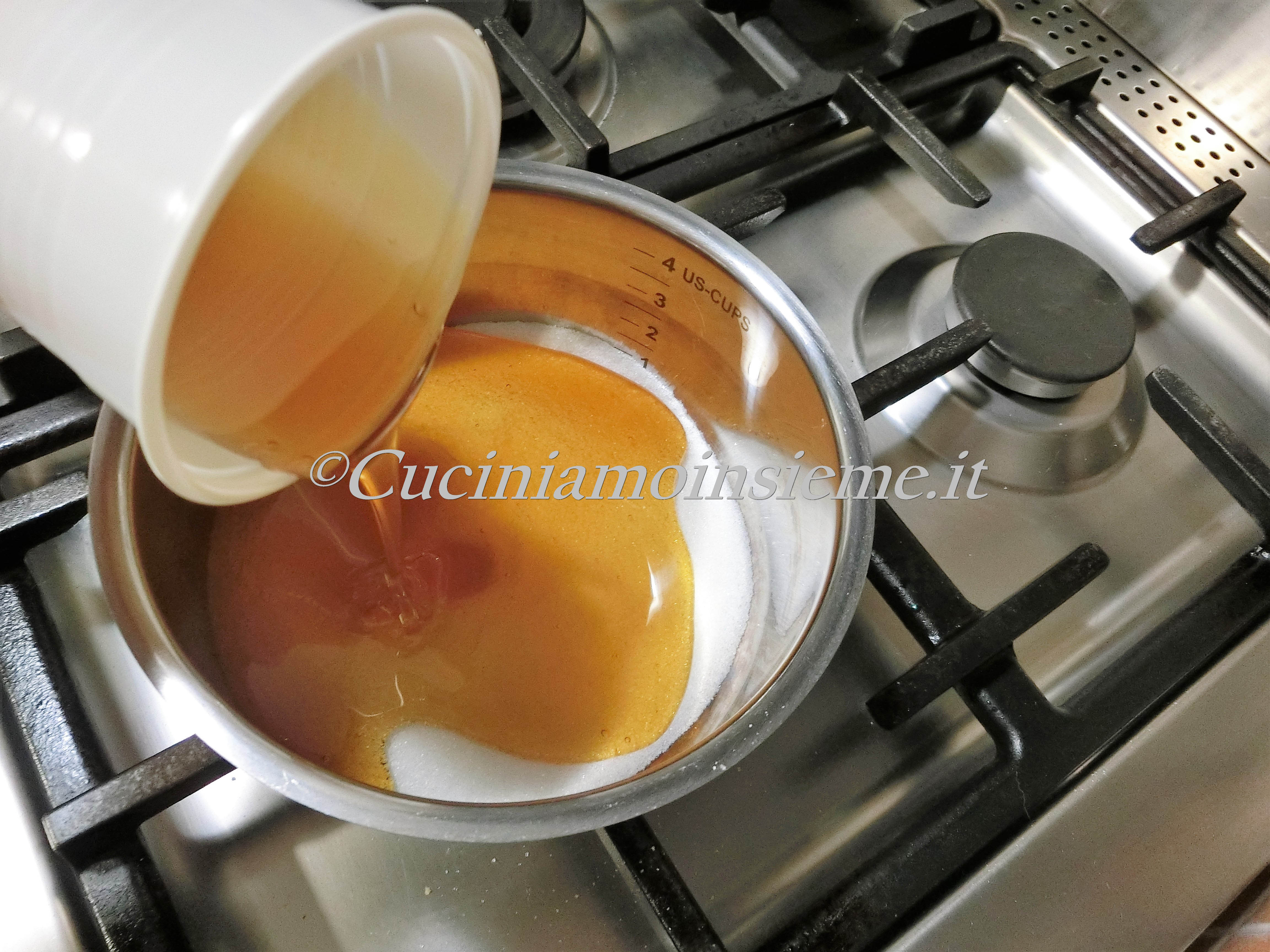 In un pentolino dal fondo pesante mettiamo lo zucchero semolato e il miele. Accendiamo la fiamma regolandola in una posizione medio-minima. Cominciamo a mescolare con un cucchiaio di legno, e continuiamo finché il composto non comincerà a sbianchire e a schiumare. A quel punto inseriamo il termometro e continuiamo a cuocere, mescolando, finché non raggiungerà la temperatura di 120°.