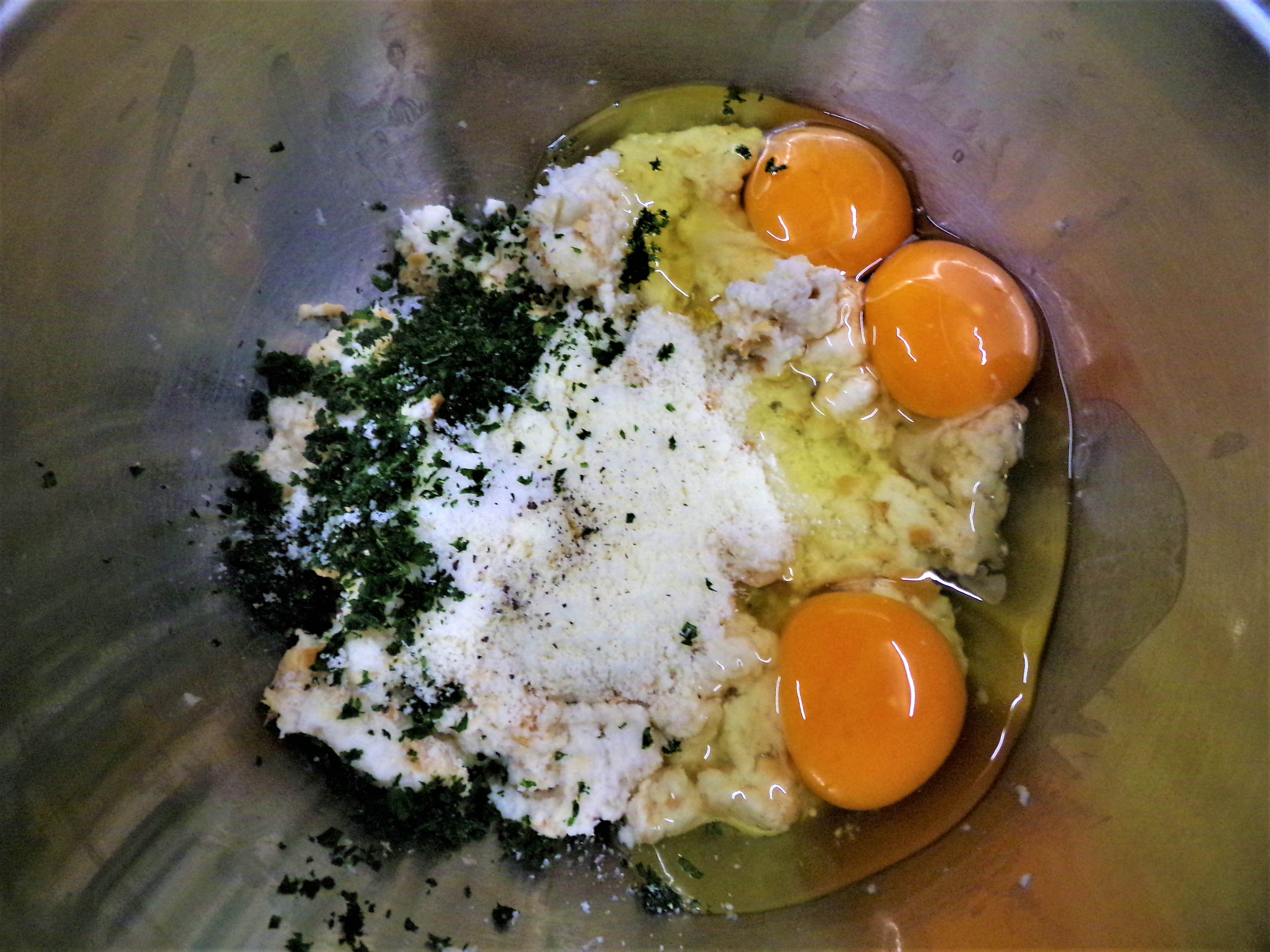 Ingredienti: Pane raffermo, 200 g – Uova di media grandezza, 3 intere – Prezzemolo tritato, 1 cucchiaio – Formaggio grattugiato (grana o pecorino), 3 cucchiai – Sale e pepe q.b. – Pangrattato (all'occorrenza)