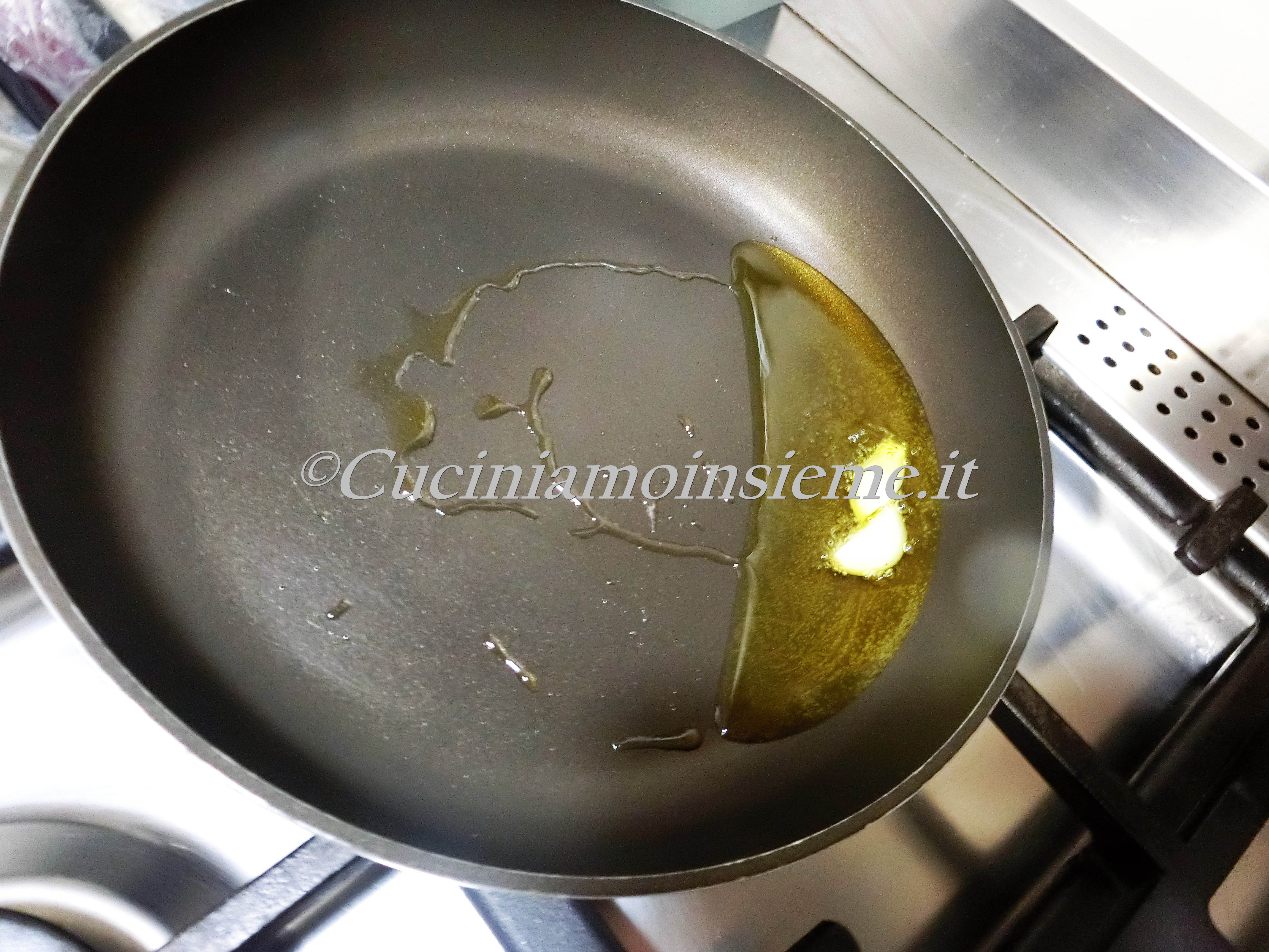 Facciamo insaporire. Spegniamo la fiamma lasciando la preparazione piuttosto brodosa. Prima di impiattare eliminiamo aglio e rosmarino |