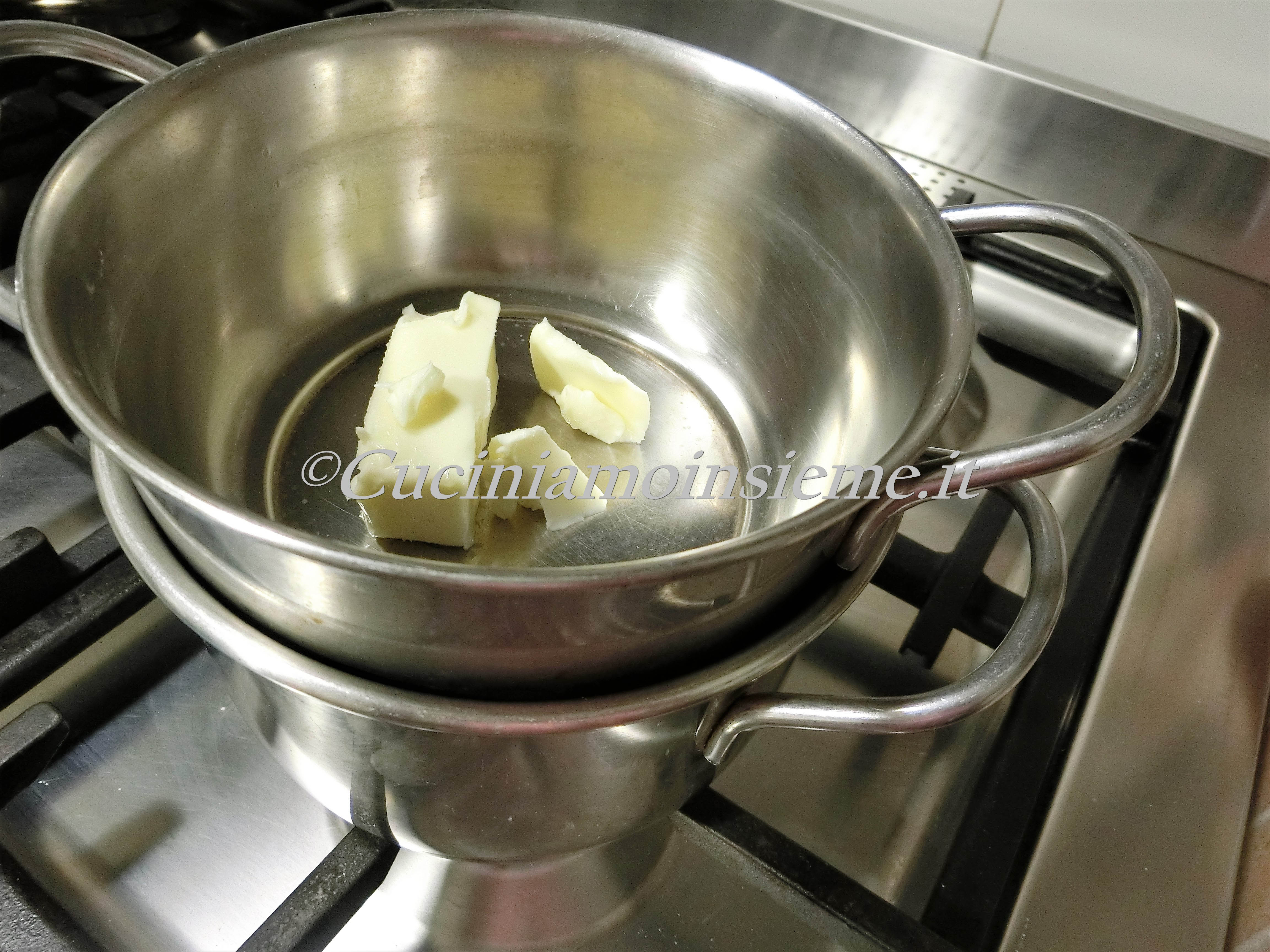 Sciogliamo a bagno maria il burro. Grattiamo la scorza di un'altra arancia non trattata (non il bianco). Sbricioliamo il lievito di birra fresco.