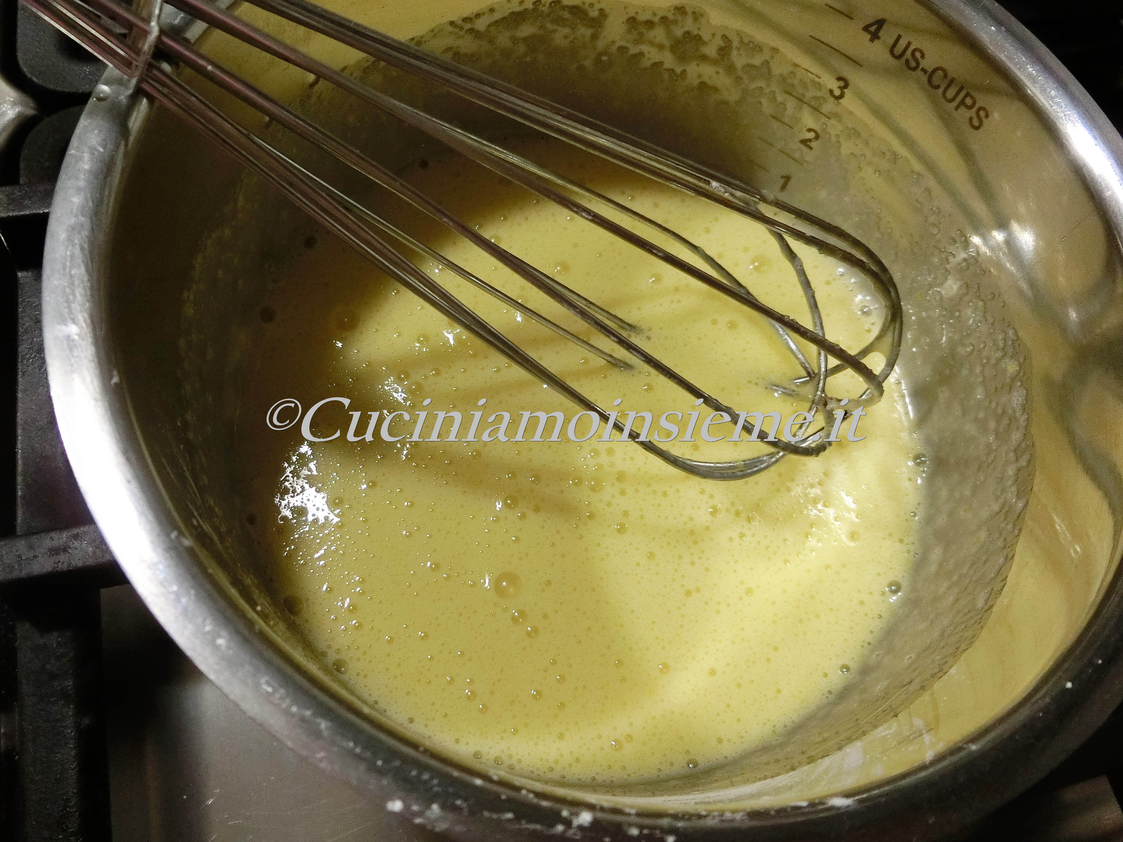 Cominciamo ad aggiungere poca per volta la farina, sempre lavorando bene con la frusta, fino ad ottenere un bel composto liscio, e decisamente più denso di una pastella. Trasferiamo in una ciotola, copriamo con della pellicola per alimenti e quindi avvolgiamo in un canovaccio. Lasciamo riposare e lievitare per circa 1 ora in un luogo caldo e al riparo da spifferi