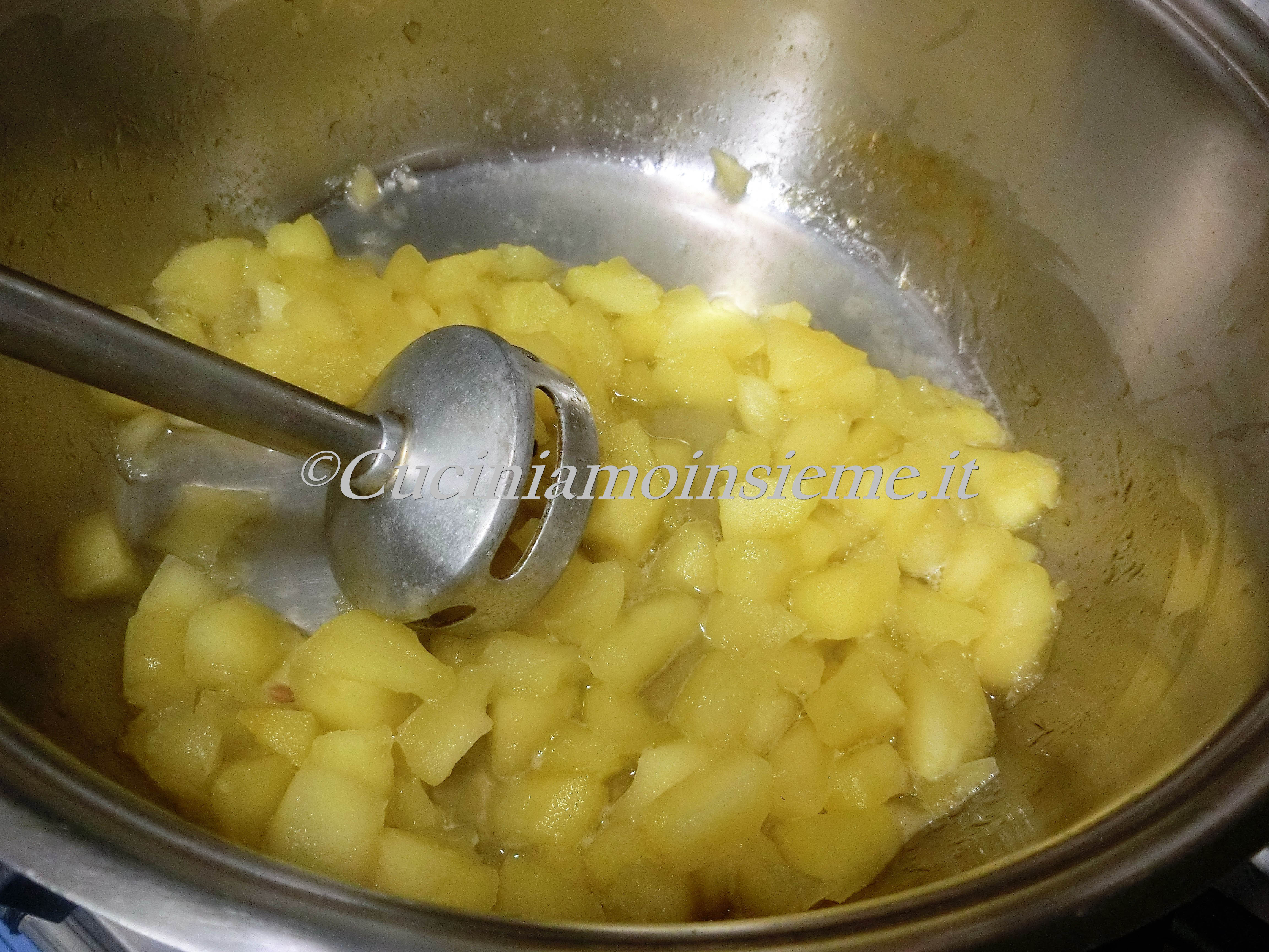 Quando le mele saranno ammorbidite allontaniamo la pentola dalla fiamma, inseriamo il frullatore a immersione e frulliamo finemente, riducendole in purea. Rimettiamo sulla fiamma aggiungendo un paio di bicchieri d'acqua non colmi