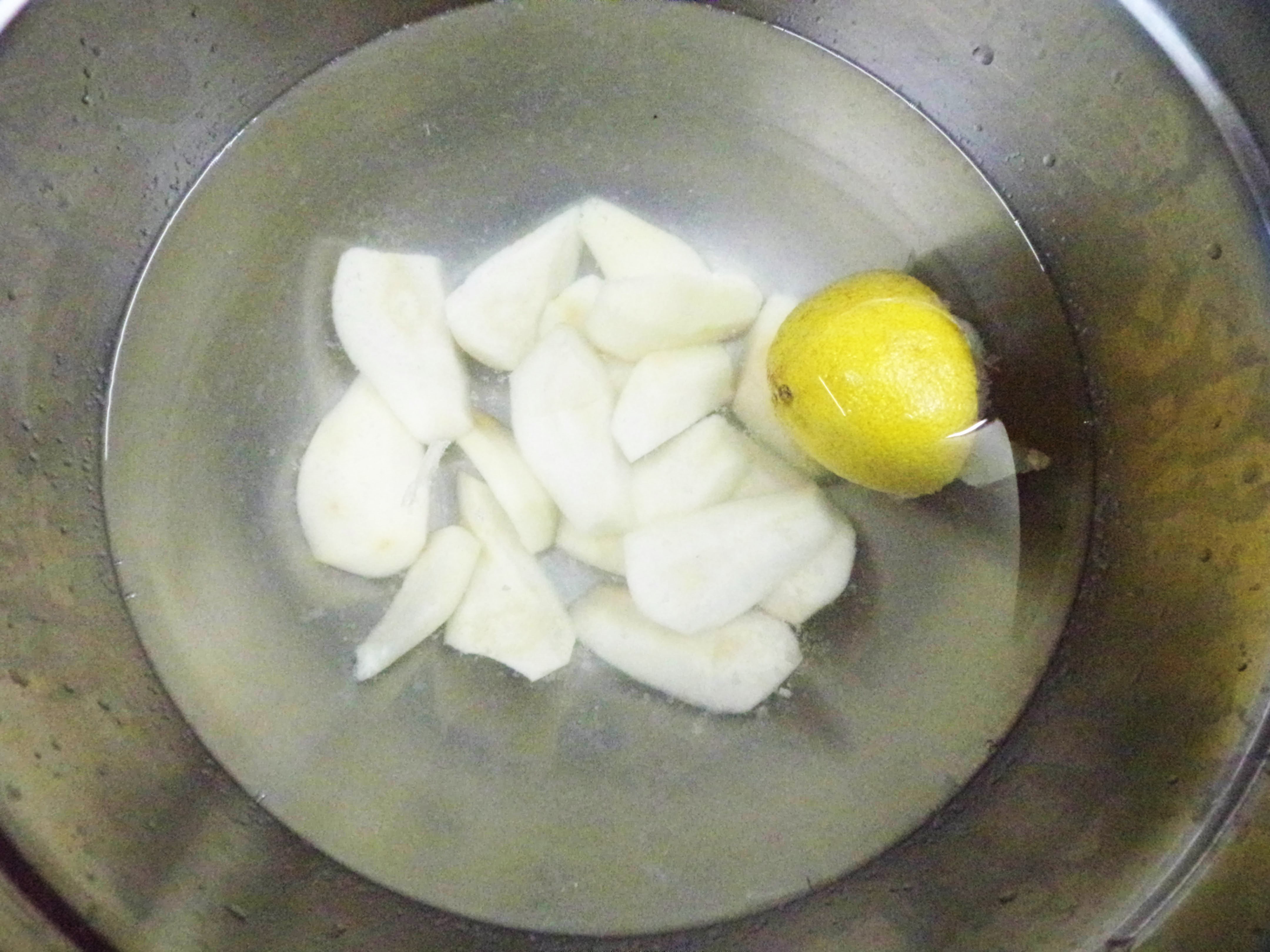 Tuffiamo i nostri spicchi in un recipiente con acqua fredda in cui avremo spremuto mezzo limone (questa operazione non farà annerire le nostre pere) |