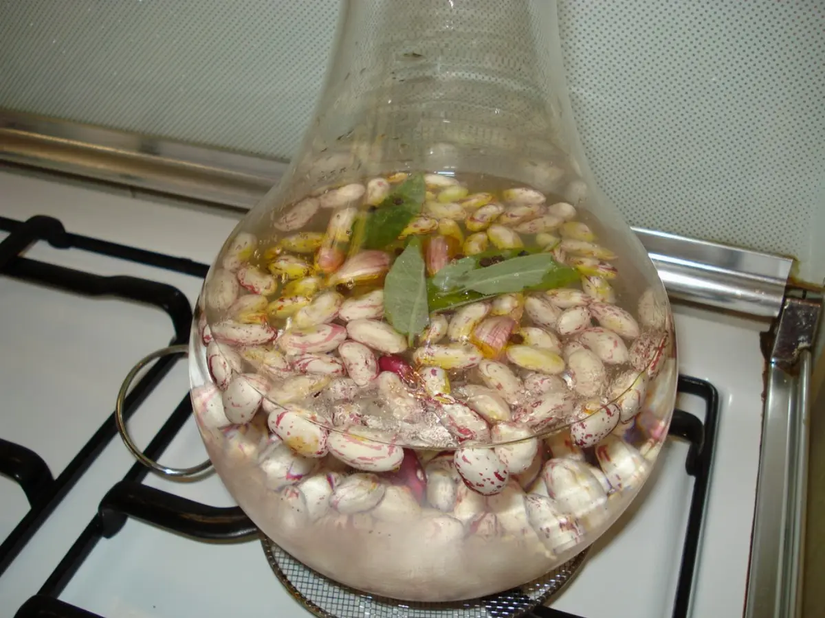 Sgraniamo i fagioli freschi (ne otterremo poco più di 1/2 kg), sciacquiamoli e mettiamoli nel fiasco. Oggi avere un fiasco del Chianti è una fortuna, perché sono sempre più rari. A rimediare ci ha pensato un noto brand italiano, che ha messo in commercio una versione moderna del fiasco, dotata anche di spargifiamma e di mestolino per estrarre i fagioli una volta cotti, e di un tappo in sughero provvisto di sfiatatoio. Questo è quello che usiamo oggi noi.