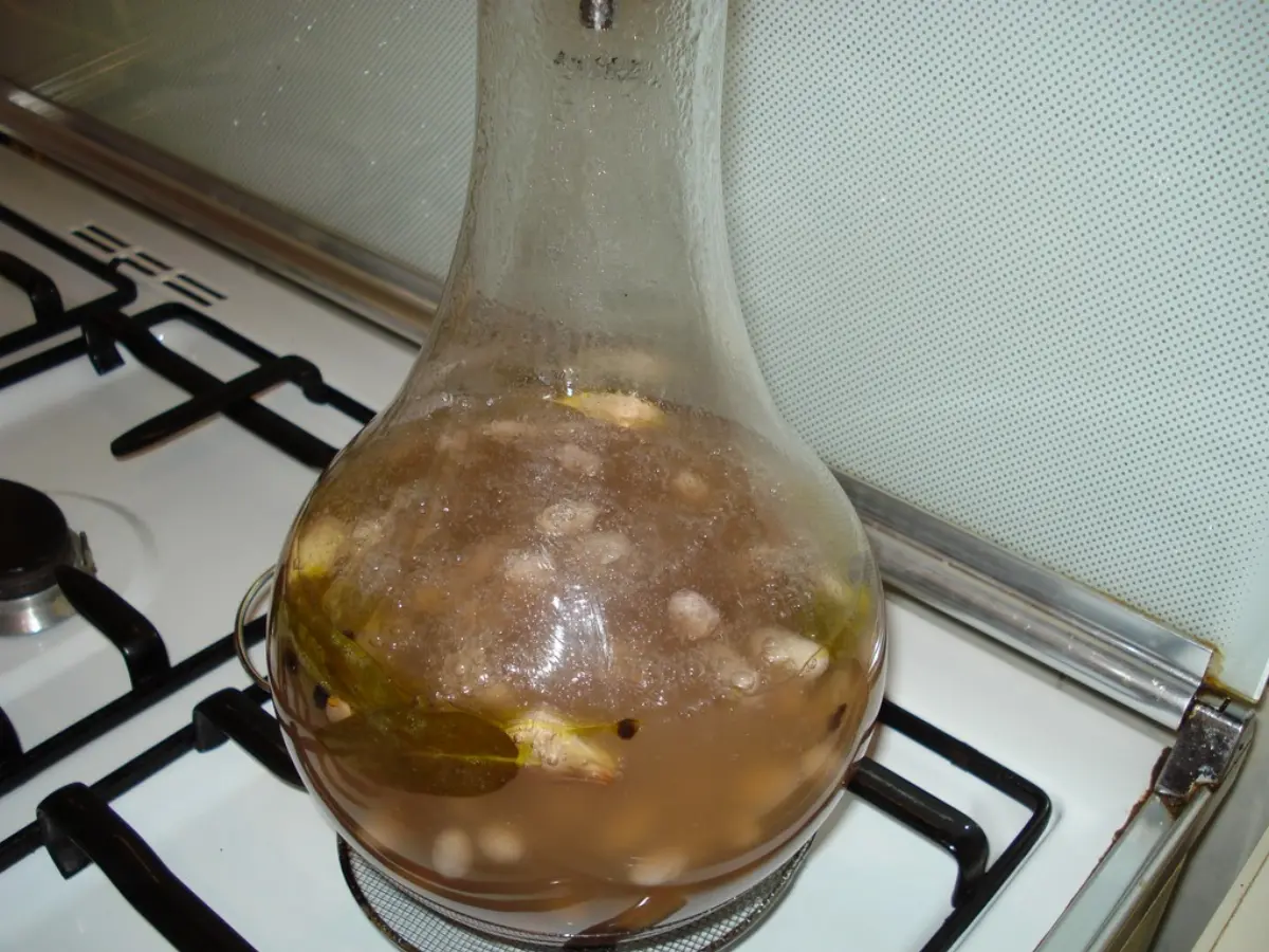 Dunque abbiamo messo i fagioli nel fiasco; aggiungiamo l'acqua, che non deve superare un certo limite (ne abbiamo messa all'incirca 1 litro). Aggiungiamo un poco di olio, l'aglio vestito, la salvia, il sale e qualche grano di pepe nero. Tappiamo e mettiamo sulla fiamma tenendo il fornello al minimo (usiamo uno spargifiamma). Ci vuole un po' di pazienza: saranno cotti in due ore.